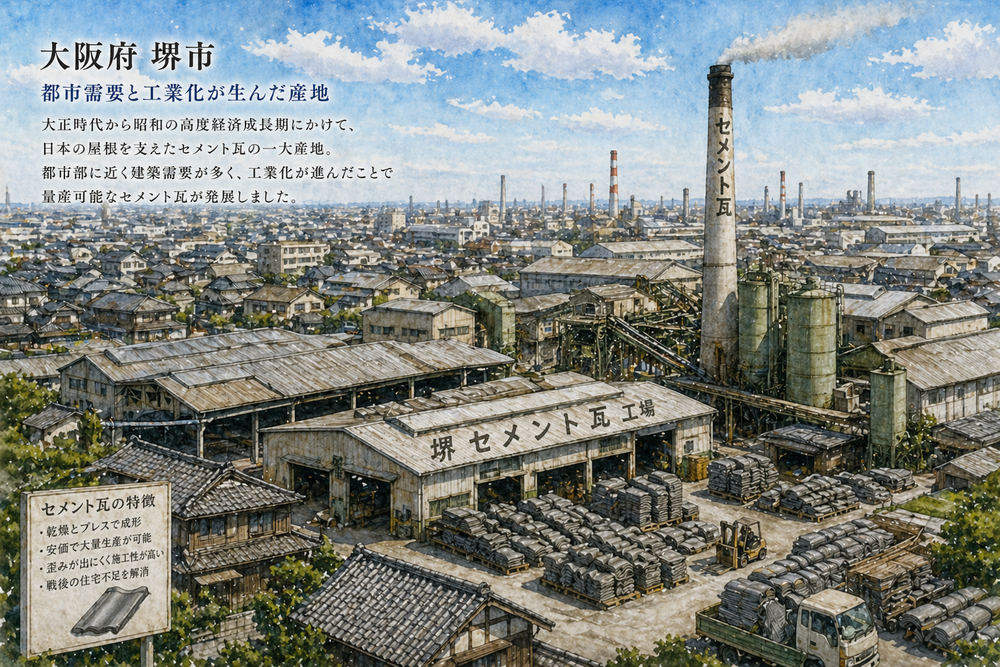 大阪、特に堺市周辺は、かつてセメント瓦の一大産地でした。大正時代から昭和の高度経済成長期にかけて、日本の屋根を支えた重要な工業製品です。
