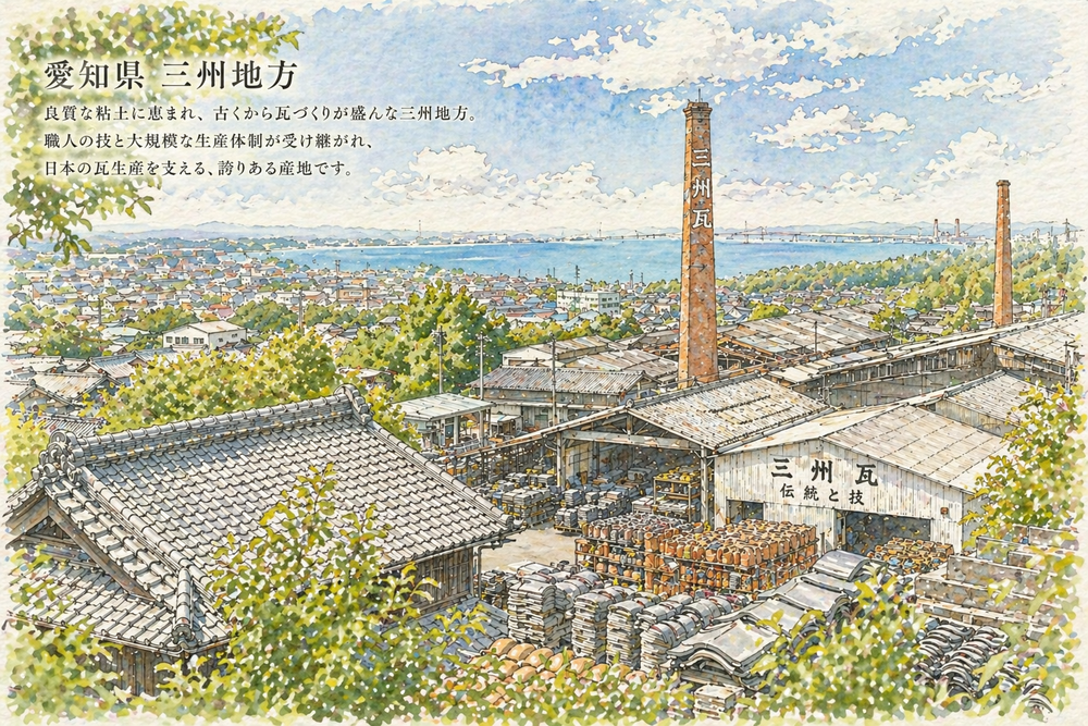 三州地方(愛知県西三河地方)は、日本最大の瓦生産地で、国内シェアの約半分を占めています。豊田市、碧南市、高浜市などで生産されています。