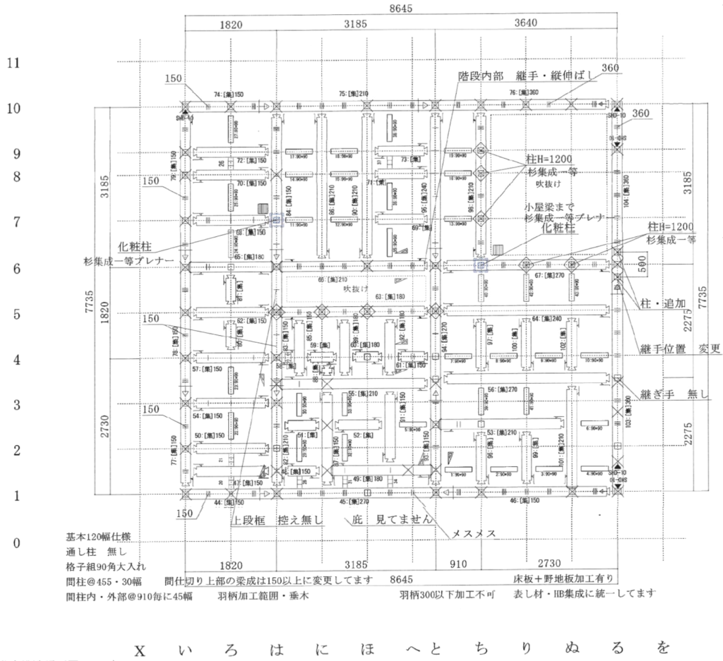 まず基本となるのが、柱・梁・桁・土台といった構造部材の仕様と寸法、配置です。これらは平面図や軸組図として表現され、どの位置にどの部材が使われるのかが一目でわかるようになっています。