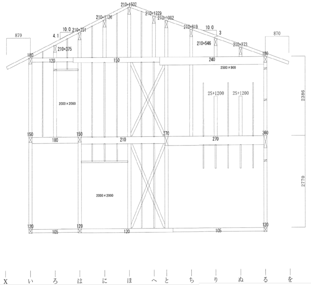 金物の取り付け位置や種類(ホールダウン金物、羽子板ボルトなど)、アンカーボルトとの関係、さらには耐力壁の位置や壁倍率に関する情報が記載される場合もあります。これらは耐震性能に直結する要素であり、設計図との整合性を確認するうえでも非常に重要です。