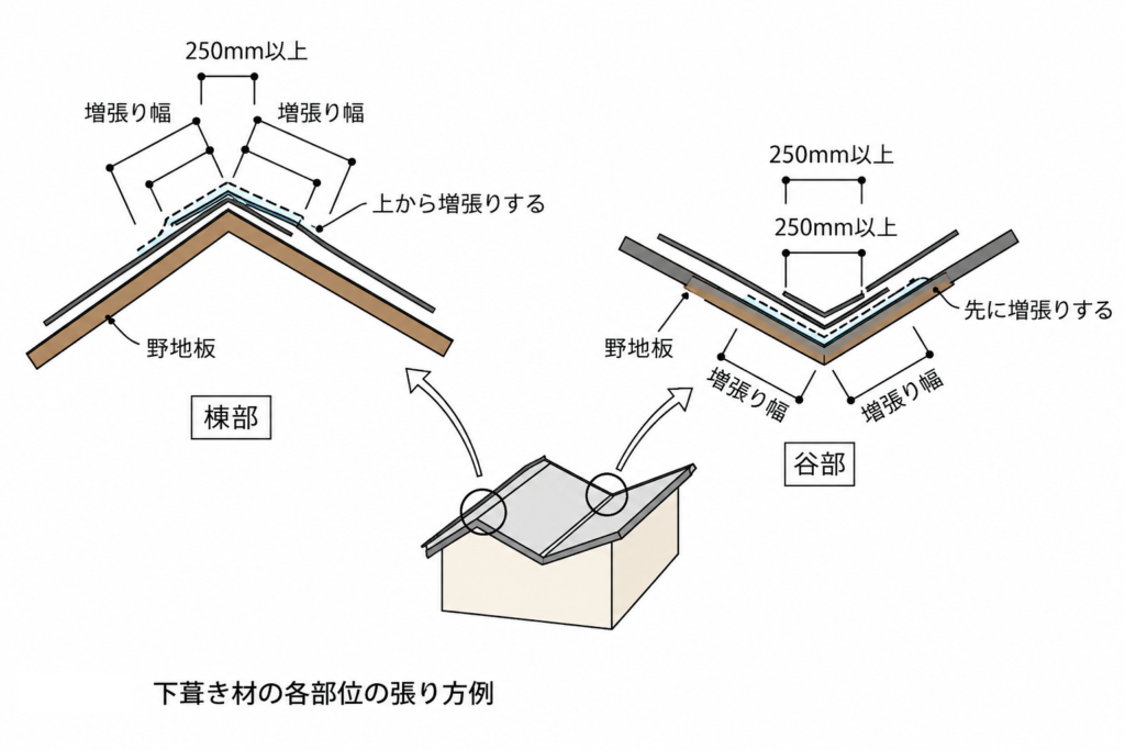 その上から、左右の屋根面の下葺き材を重ねて施工し、それぞれ谷底から250mm以上立ち上げるようにします。この重ね幅が不足すると、雨水の逆流や吹き込みによる浸水のリスクが高まるため、確実な寸法確保が必要です。