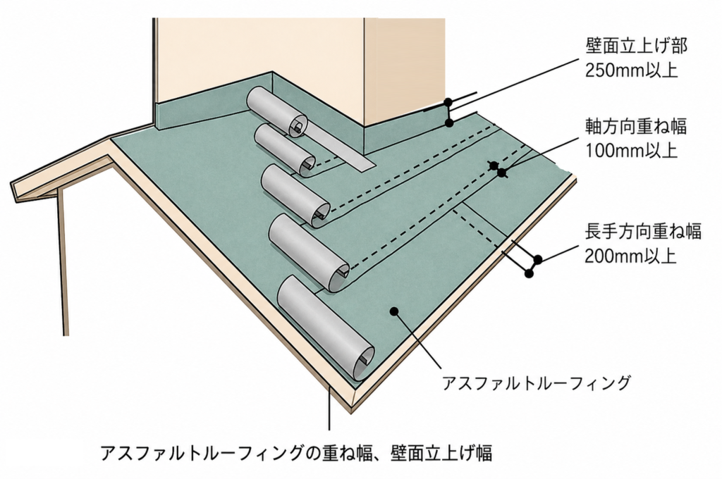 屋根と壁が接する部分(取り合い部)は、雨水が横から吹き込むリスクが高い箇所です。この部分では、下葺き材を壁面に沿って250mm以上立ち上げることが基本となります。立ち上がり高さが不足すると、強風時の吹き込みによって簡単に浸水してしまいます。