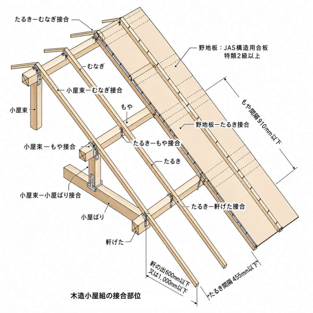 - 留め方のポイント: 釘を使用する際は、垂木や野地板の接合部に対して直角に打ち込むことが重要です。また、釘頭が木材に埋まるほど打ち込むことで、風や荷重に対する耐久性が高まります。金物は、施工後に緩みや変形がないかを定期的に確認し、必要に応じて補強を行います。