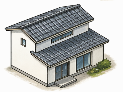 腰掛け屋根は、主屋根の途中にもう一段小さな屋根が“腰掛ける”ように設けられた形状です。段違いの屋根構成となり、外観に立体感と変化を与えるのが特徴です。