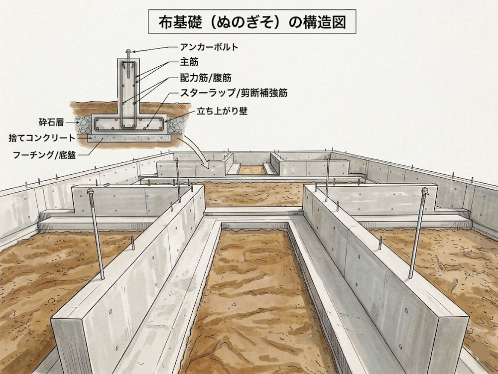 - コンクリートの帯状配置: 布基礎は、建物の重量を主要な壁の下で受け止め、地盤に伝達します。これにより、地盤の変形に対する柔軟性を持たせることができます。