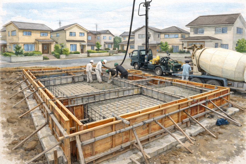 べた基礎は、建物全体の床面を一体的にコンクリートで覆う工法で、耐震性能が高く、近年多くの住宅で採用されている工法です。