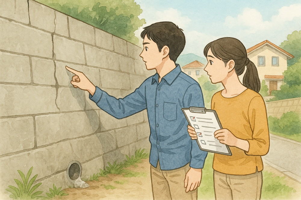 ここでは、傾斜地の擁壁を中心に、誰でも現地で確認できるセルフチェックポイントを順に紹介します。「一つでも当てはまるかどうか」を意識しながら、落ち着いて確認してみてください。