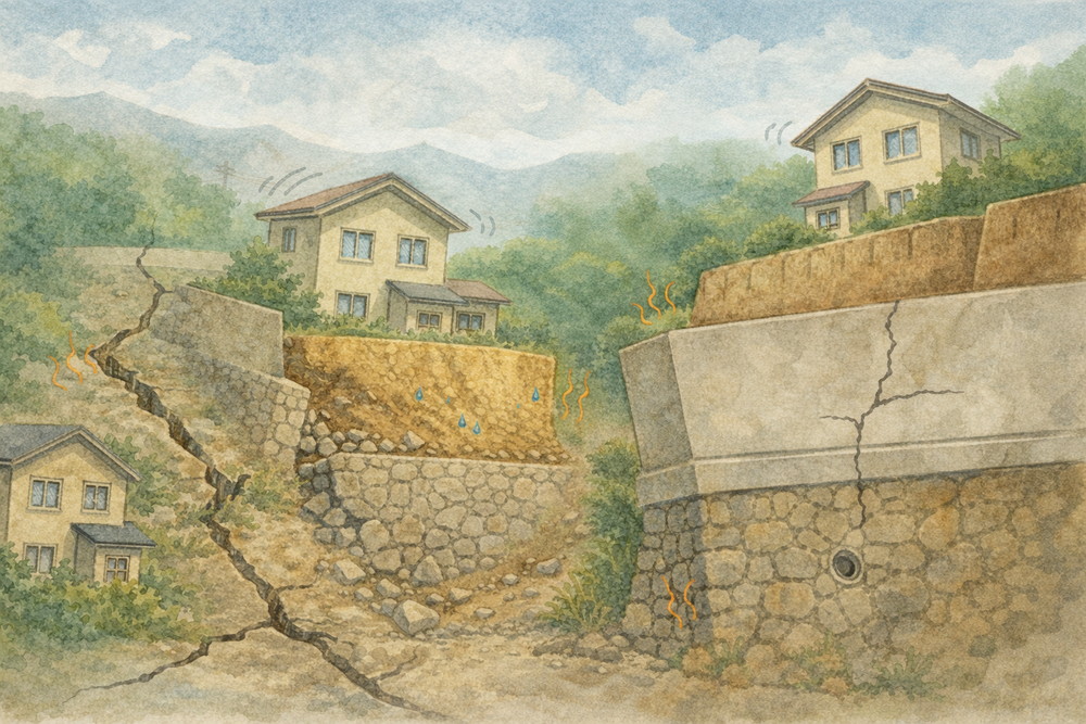 こうした条件が重なり、擁壁や宅地に被害が集中することがあります。