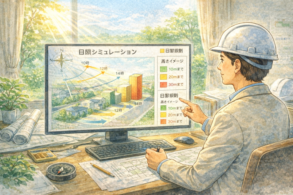 都市部では、日影規制(にちえいきせい) が設定されている地域もあります。これは、周囲に過度な影を落とさないためのルールですが、逆に言えば、 将来、隣地にどの程度の建物が建つ可能性があるかを予測するヒントになります。建築士に簡易シミュレーションを依頼すると、より具体的な判断が可能です。