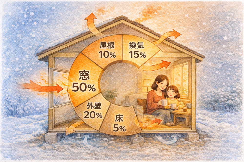 ✅ 冬は約50%、夏は約74%の熱が窓から出入りする
